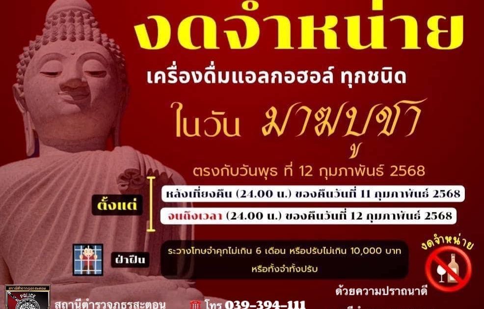 งดจำหน่าย เครื่องดื่มแอลกอฮอล์ ทุกชนิด เนื่องในวัน มาฆบูชา