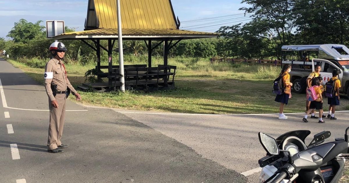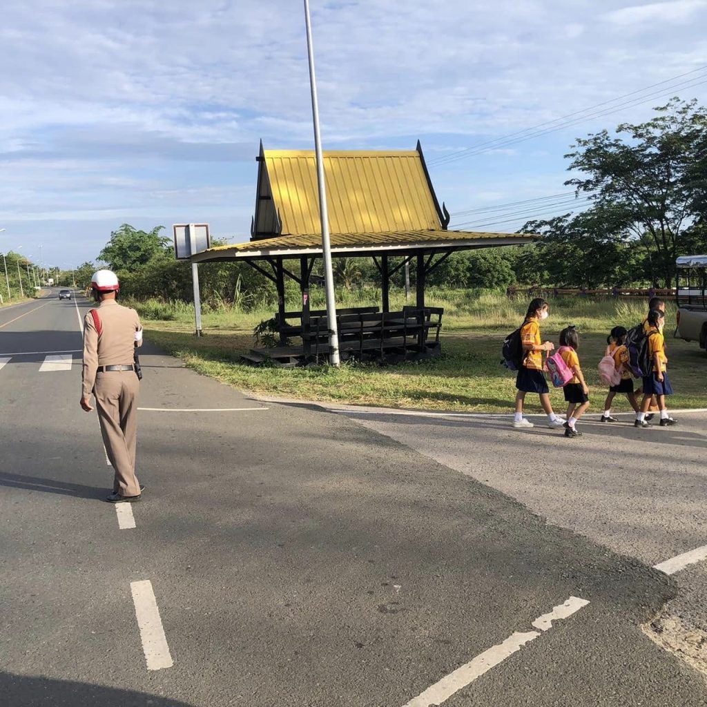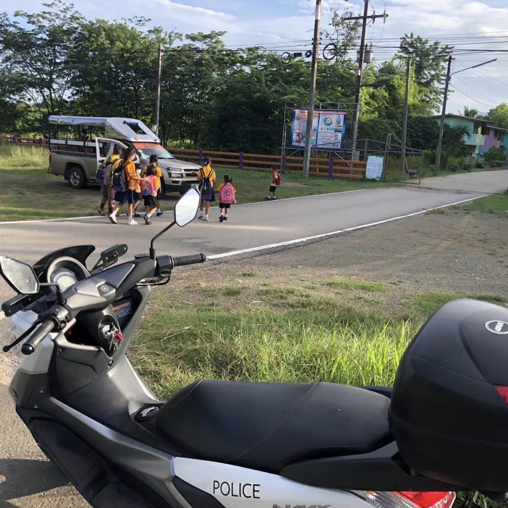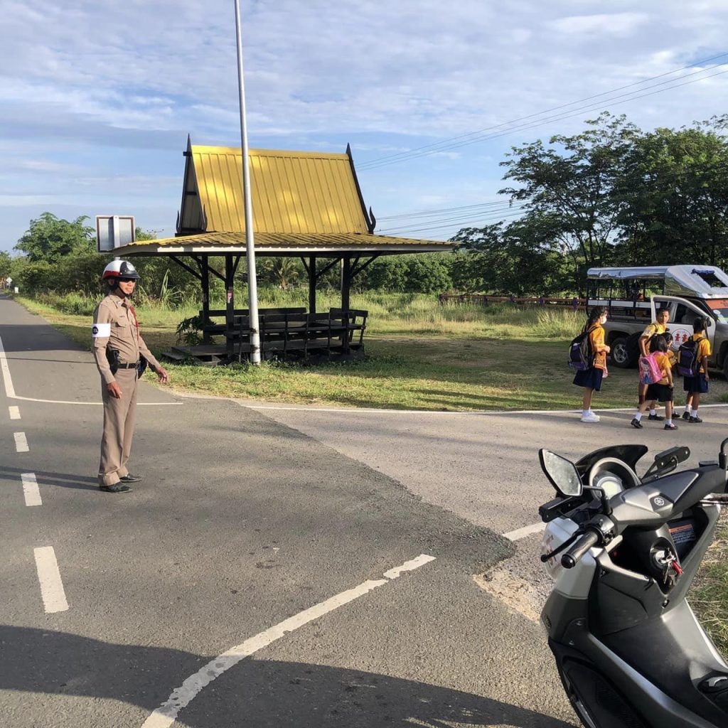 สายตรวจจราจรสถานีตำรวจภูธรสะตอน ออกอำนวยความสะดวกและจัดการจราจร บริเวณ หน้า รร. ในเขตรับผิดชอบ
