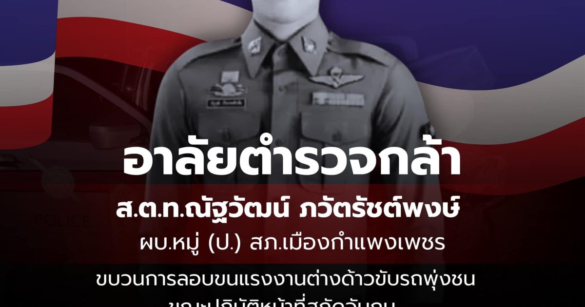 สำนักงานตำรวจแห่งชาติขอแสดงความเสียใจต่อครอบครัวของ ส.ต.ท.ณัฐวัฒน์ ภวัตรัชต์พงษ์ ผบ.หมู่ (ป.) สภ.เมืองกำแพงเพชร อายุ 28 ปี ถูกคนร้ายขับรถพุ่งชน เสียชีวิตขณะปฏิบัติหน้าที่สกัดจับกุมขบวนการลักลอบขนแรงงานต่างด้าว บริเวณหน้าสถานีอนามัยหนองปิ้งไก่ ถนนหลวงหมายเลข 1116 ม.13 ต.นาบ่อคำ อ.เมือง จว.กำแพงเพชร เมื่อกลางดึกวันที่ 17 ธันวาคม 2567
