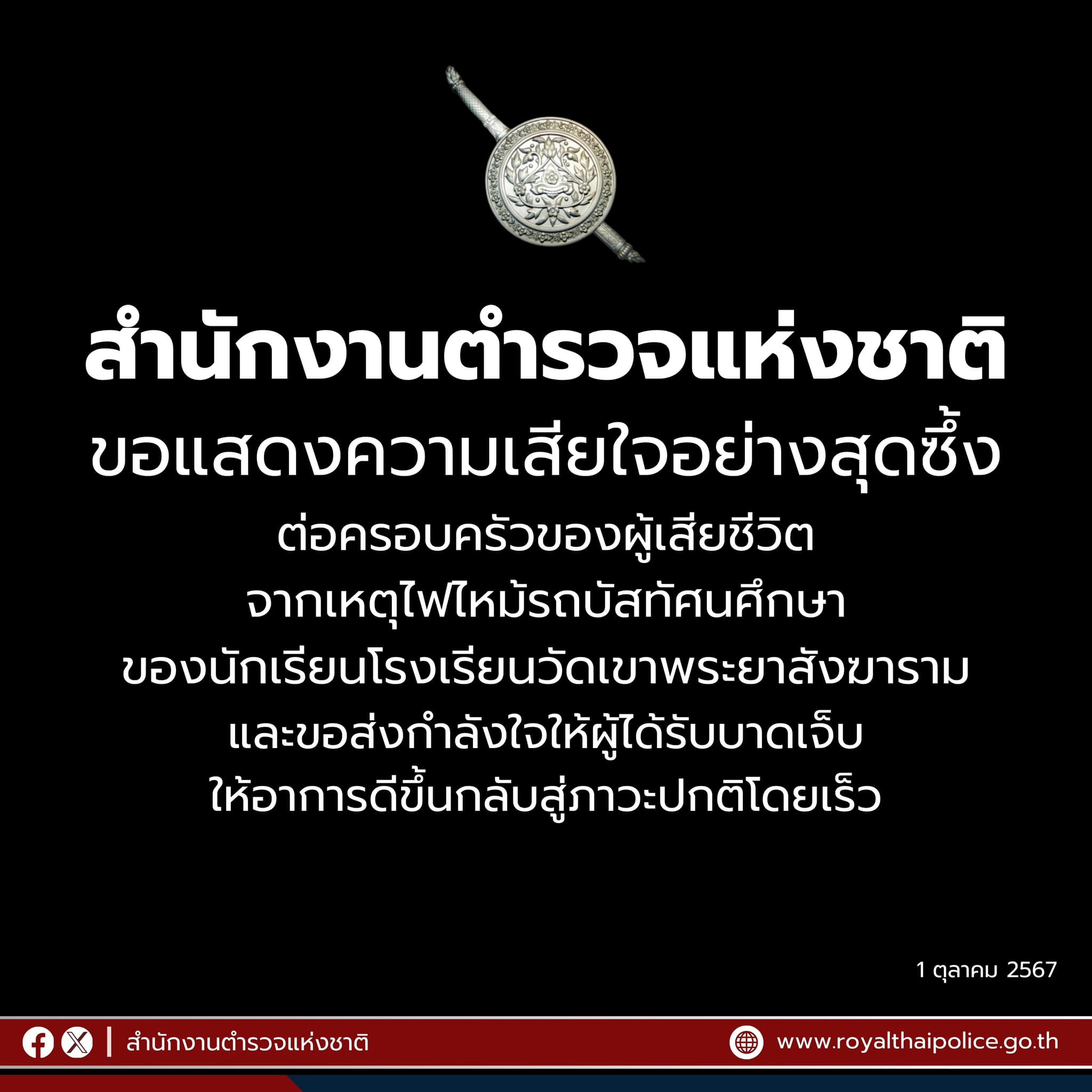 สำนักงานตำรวจแห่งชาติ ขอแสดงความเสียใจอย่างสุดซึ้ง ต่อครอบครัวของผู้เสียชีวิต จากเหตุไฟไหม้รถบัสทัศ