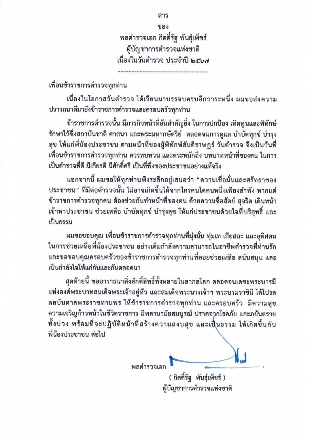 เนื่องในวันตำรวจ 17 ตุลาคม 2567 พล.ต.อ.กิตติ์รัฐ พันธุ์เพ็ชร์ ผู้บัญชาการตำรวจแห่งชาติ ส่งสารถึงข้าร