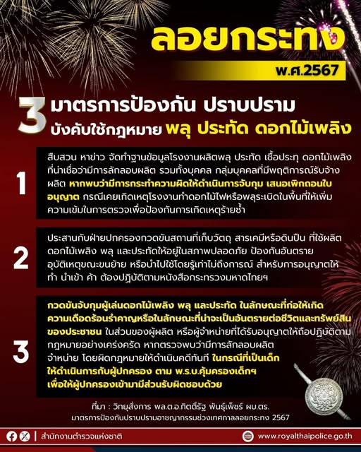 3 มาตรการป้องกัน ปราบปราม บังคับใช้กฎหมาย พลุ ประทัด ดอกไม้ไฟ . ลอยกระทง 2567 “ลอยกระทง วิถีไทย ปลอด