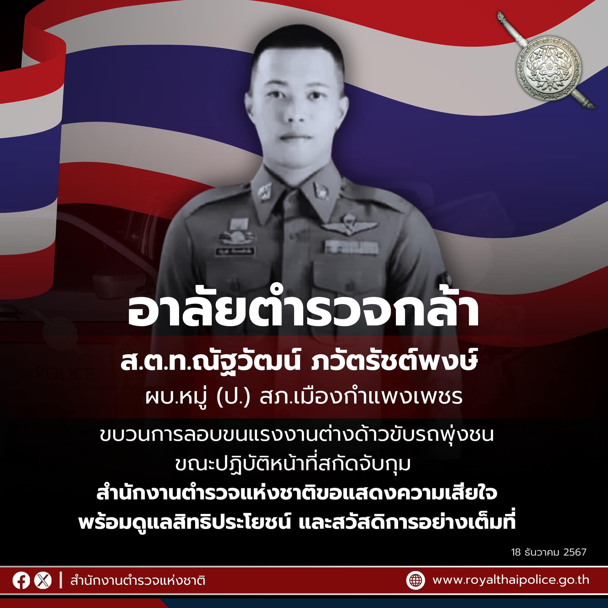 อาลัยตำรวจกล้า สำนักงานตำรวจแห่งชาติขอแสดงความเสียใจต่อครอบครัวของ ส.ต.ท.ณัฐวัฒน์ ภวัตรัชต์พงษ์ ผบ.ห