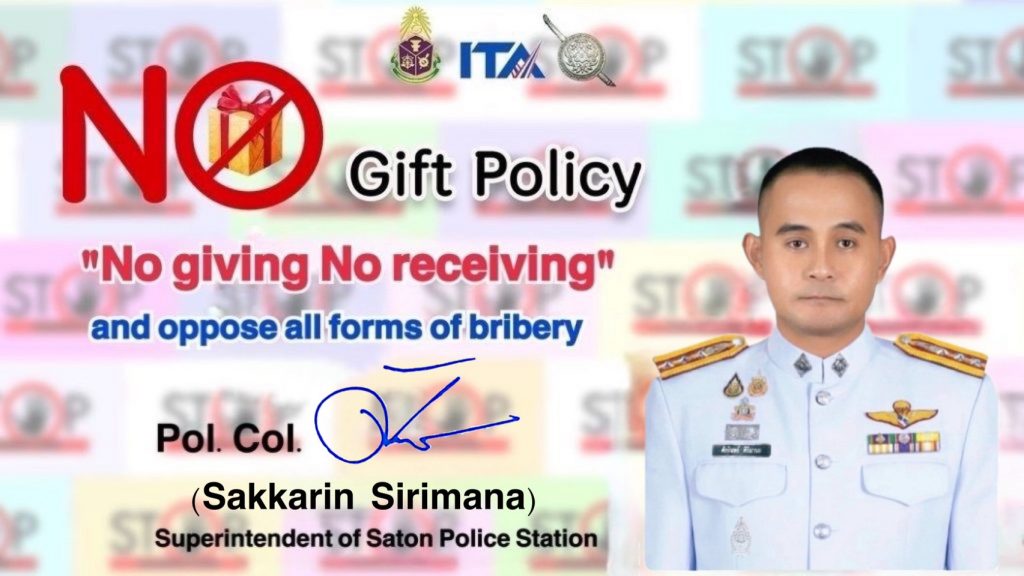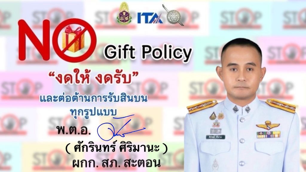 ภาพแสดงป้ายประชาสัมพันธ์เผยแพร่นโยบายาศสถานีตํารวจภูธรสะตอน เรื่อง นโยบายต่อต้านการรับสินบน (Anti-Bribery Policy) และการไม่รับของขวัญของกํานัลหรือประโยชน์อื่นใด (No Gift Policy) จากการปฏิบัติหน้าที่ประจําปีงบประมาณ พ.ศ.๒๕๖๙ ภายในหน่วยงาน